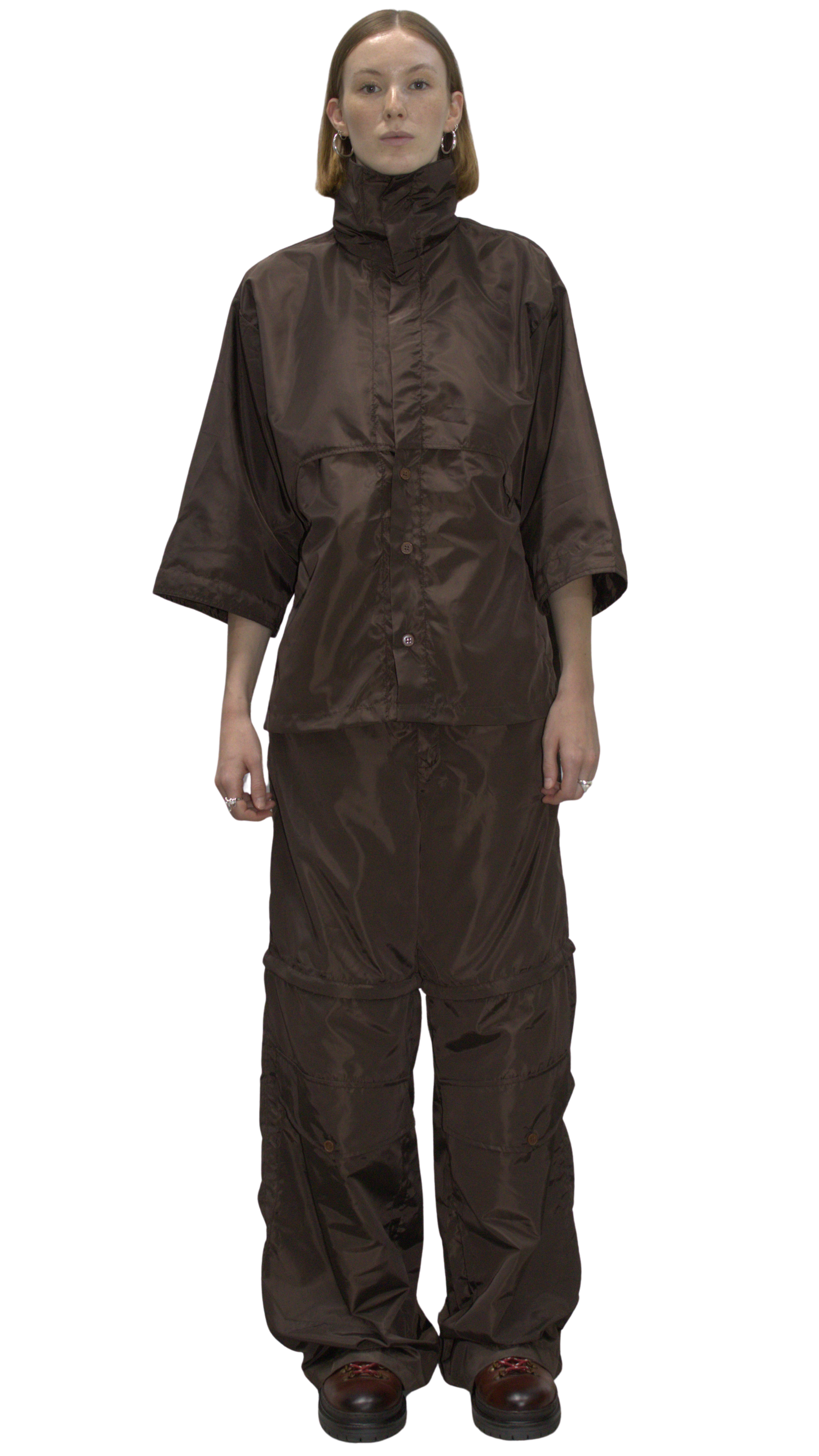 Long-sleeve top made from a nylon-polyester blend with a soft, smooth feel. Features a high zip-up neck and wide sleeves. Boxy silhouette with a half-button front closure below the chest and a zipper from chest to collar. Embroidered logo at the back neck.