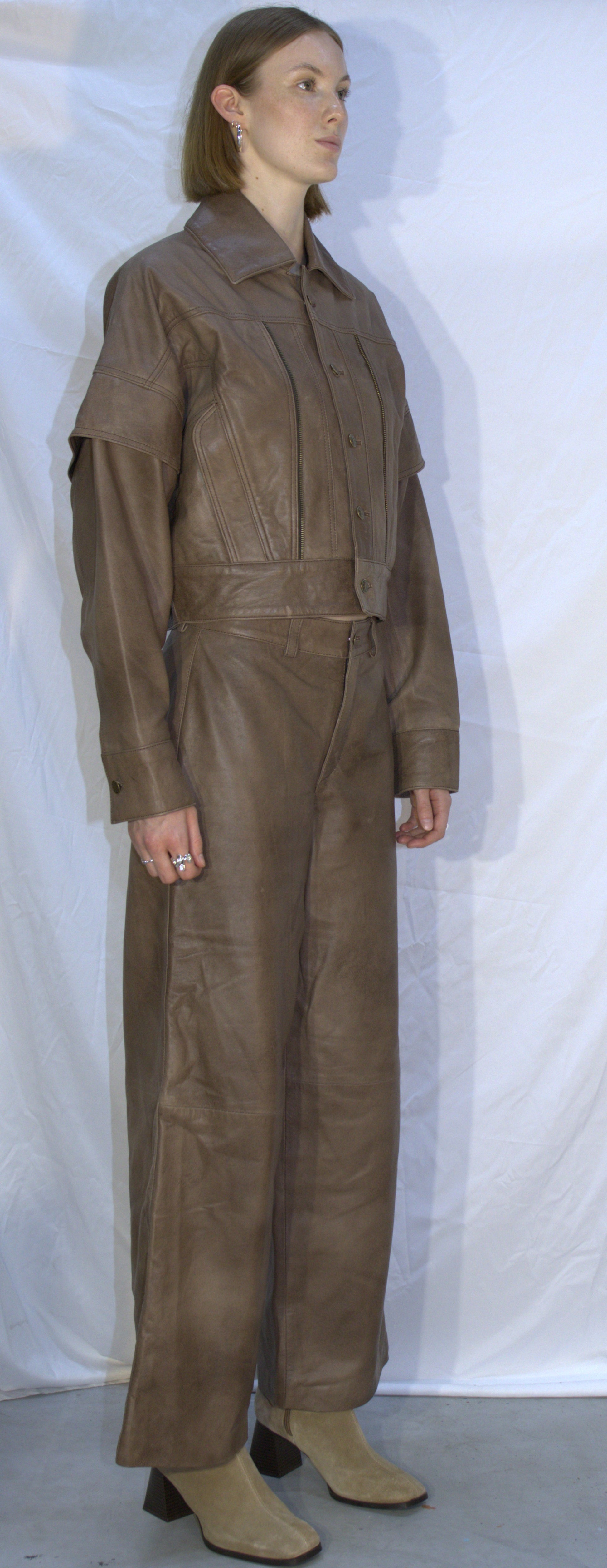 Wide-leg leather trousers with a slight flare at the hem. Structured with a horizontal knee panel. Made from soft, distressed leather.